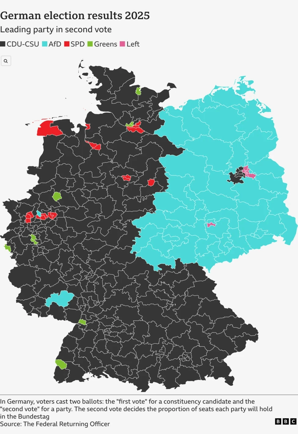 Is dat zo? Ik weet er niet genoeg van, maar misschien horen wij hier in het Westen er niet niet genoeg over. Als je kijkt naar Oost-Duitsland bijvoorbeeld, de voormalige DDR (die misschien wel de meest fanatieke aanhangers van het Sovjet-communisme waren) zie je dat bij de laatste verkiezingen in Duitsland een heel duidelijk beeld ontstaat dat het voormalige Oost-Duitsland nog steeds sterk gesegregeerd is van de rest van Duitsland, waarbij Oost-Duitsland voor de AfD kiest (de extremistisch-fascistisch-communistisch en pro-Rusland gezinde radicaal-rechtse politieke partij) en de rest van Duitsland voornamelijk op het ietwat meer gematigde maar nog steeds oerconservatieve CDU-CSU leunt. Zie deze kaart: