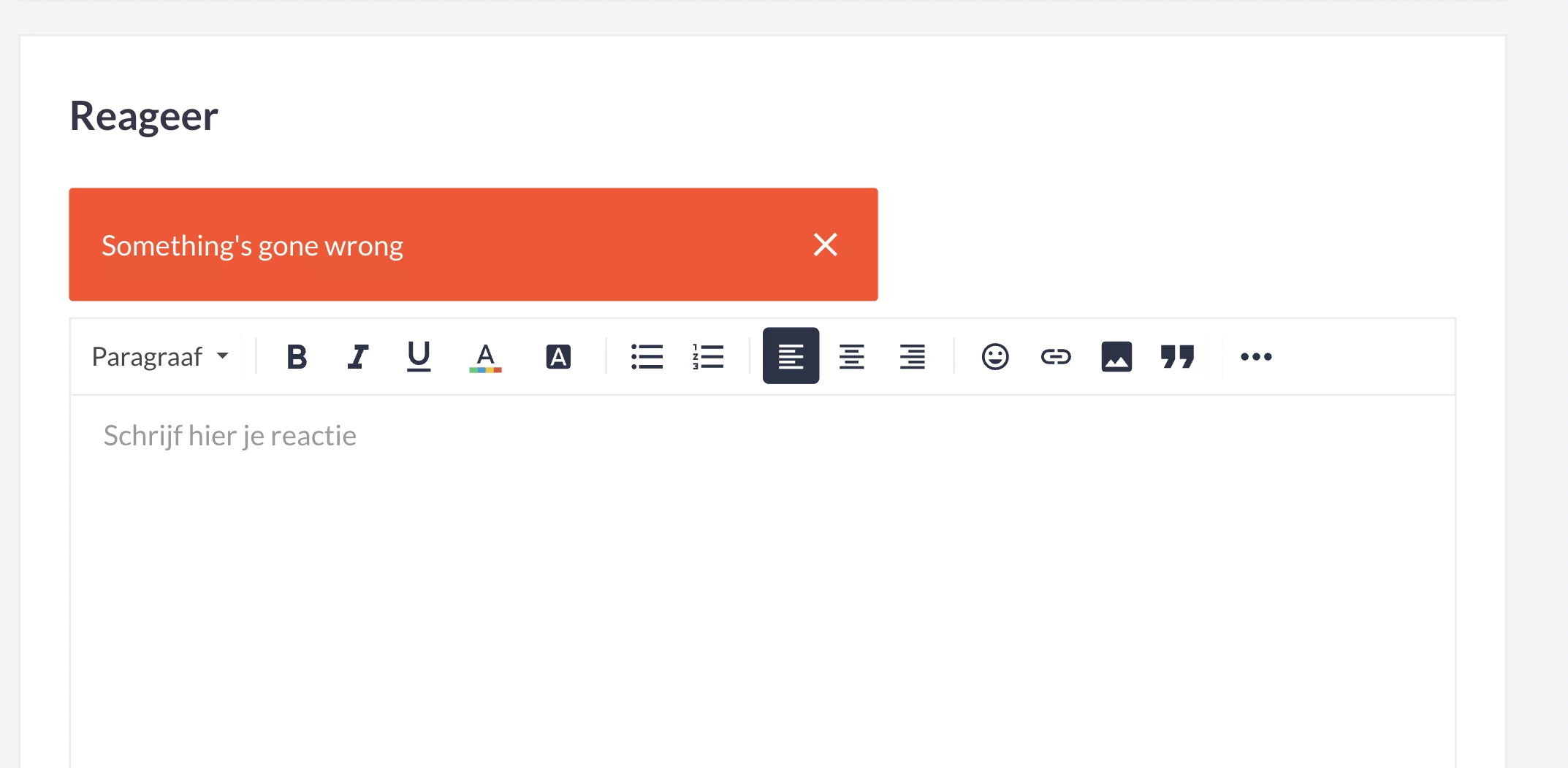 Uhhh…. Wat is dit??? Ik krijg dit als ik een reactie wil plaatsen, ivm dat berichtje van we gaan je topic/reactie checken en dan komt die op die community te staan etc…. krijg ik ‘Something's gone wrong’. Daarna is m’n bericht weg, en kan ik weer helemaal op nieuw beginnen met typen.