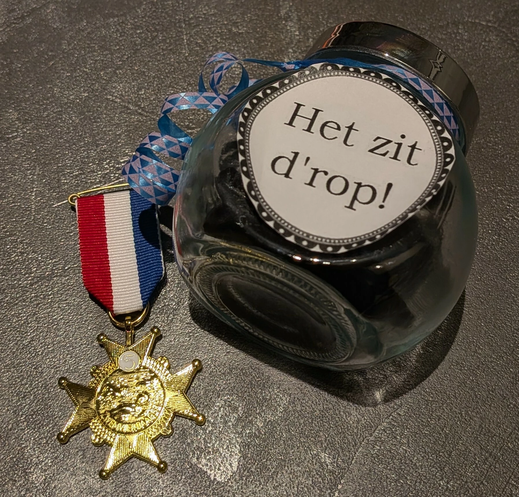 Iedereen kreeg een medaille en een potje dropjes 😋Ik kreeg een gouden medaille met een 5 erop omdat ik voor de 5e keer meedeed.